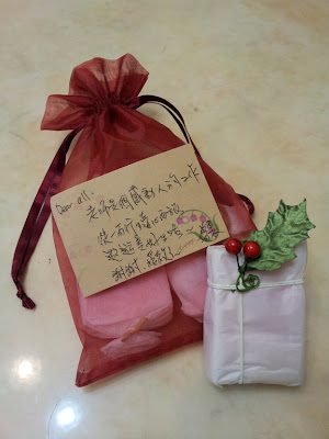 兩個梯次總共四天的課程今天就要告個段落了,卻在今天中午休息時間出現了小驚喜,上一梯次的學員特地精心製作手工香皂來到教室當面送給我!看著小卡片上寫著「老師是個感動人的工作」,謝謝這一句很短的話,卻讓我的心很溫暖也超感動! — 在台北市