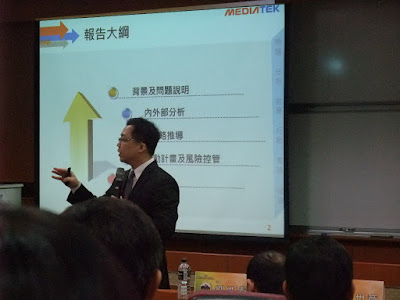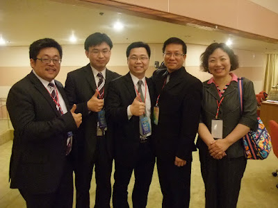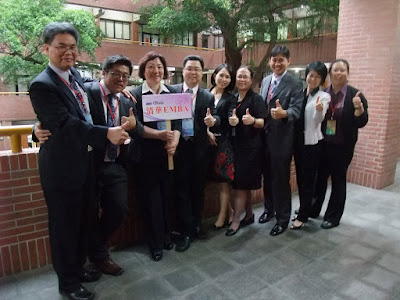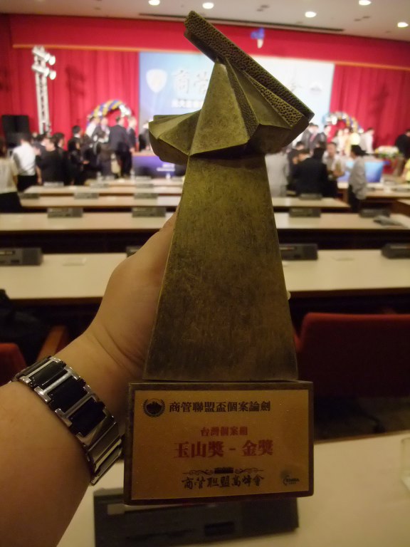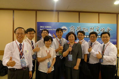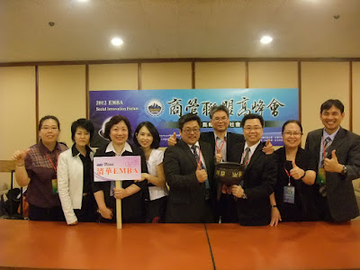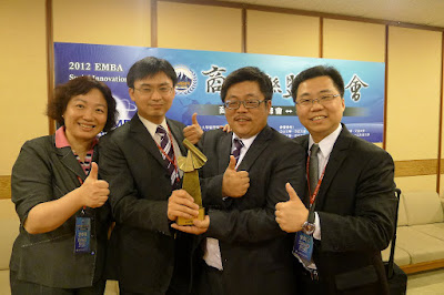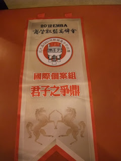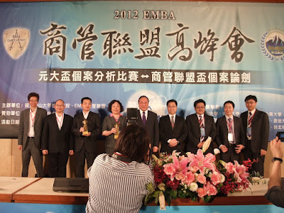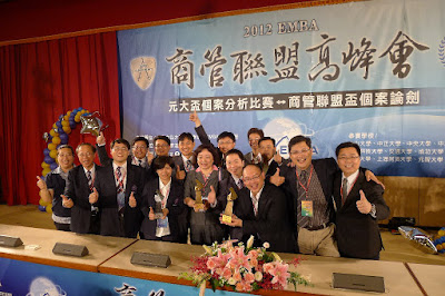 今天是連續第二天在高雄中山大學舉辦,來自全國EMBA的菁英們齊聚一堂,參加2012 EMBA商管聯盟高峰會商管聯盟盃個案論劍比賽,每隊須由兩所學校跨校組隊而成,所有隊伍從事先選擇個案起,必須在比賽前完成個案分析,製作個案PPT,並到比賽現場上台簡報,接受評審的評分,最後經過一連串的考驗,我們這一隊由清華大學與台灣科技大學各四位學長姐的組合終於拿到台灣個案組的冠軍,謝謝老師們這幾個月來的教導,謝謝八位隊員的協力同心,合力斷金,合力拿下冠軍金獎,大家真是超棒!