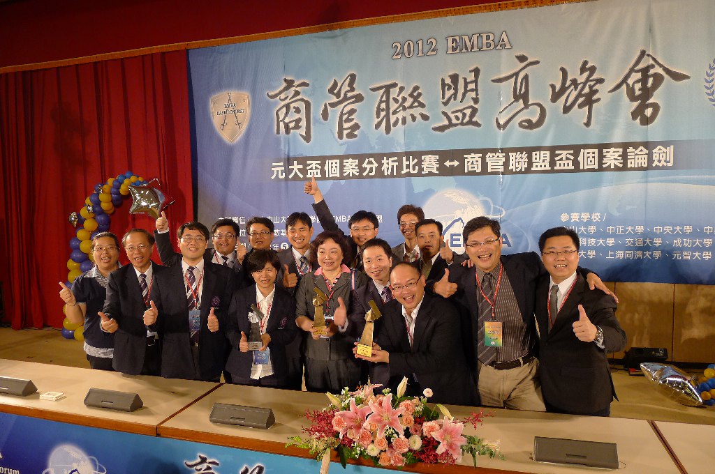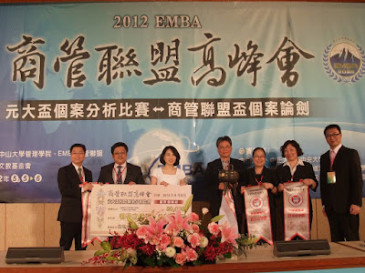 2012年5月5日與5月6日一連2天在高雄西子灣中山大學,我有幸參與組隊代表清華大學參加2012年全國EMBA商管聯盟高峰會所舉辦的兩個比賽「元大盃校際個案分析比賽」與「商管聯盟盃個案論劍賽」,這是兩岸三地頂尖華人EMBA間的標竿賽事,透過參與個案分析競賽方式,達成EMBA校際間相互交流與共同學習,並提升EMBA學員邏輯分析與解決實務議題能力,來自企業菁英的學員彼此腦力與簡報較勁,經過一連串的考驗,最後我們清華大學EMBA13代表隊拿下雙料冠軍,分別是「百年六合隊」奪得「元大盃個案分析比賽」國際組冠軍:君子之爭鼎,另外,我們清華大學與台灣科技大學組成的「龍吟虎嘯沐春風隊」聯手奪得台灣個案組冠軍:玉山獎。