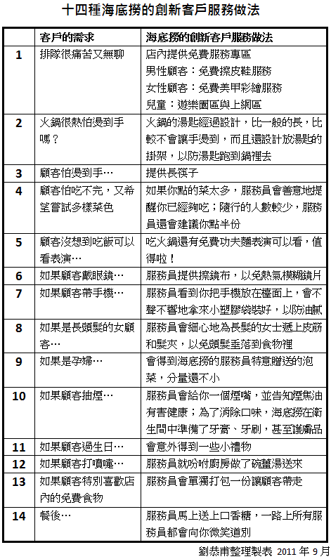 本著「同行不是冤家、異業可以為師」的精神,所以以下分享整理十四種海底撈的創新客戶服務做法供讀者參考: