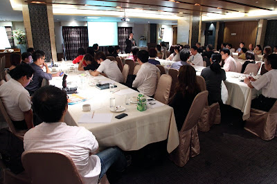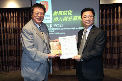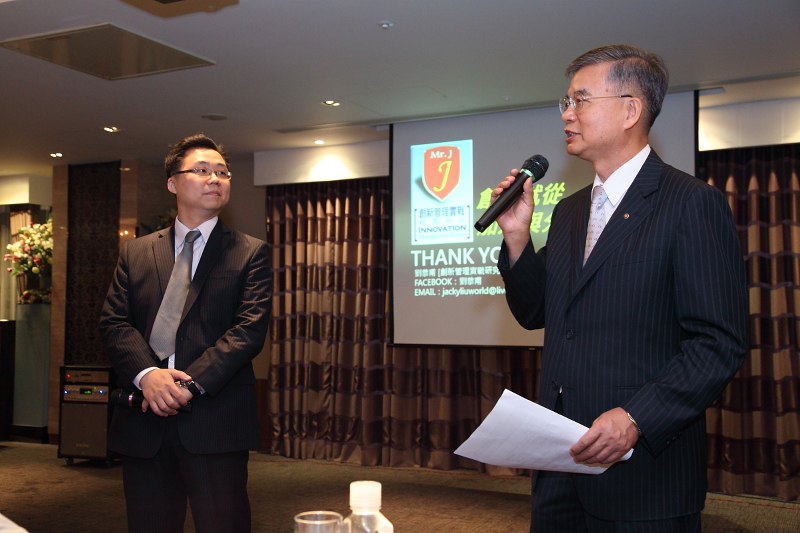 2. 我平時經常在企業內部與學校機關談創新,但是向一群總經理與企業家二代談創新卻是第一次,我覺得困難的地方倒不是要讓他們接受創新思維,而是要讓這群有著豐富管理與創業經驗的老闆們知道如何透過創新改變他們的企業以提高競爭力,這群人是最有權力與能力改變企業的人,所以我告訴自己只要能讓他們帶走一個觀念回去企業開始發酵我就成功了。所以在演說中以實際經驗與個案開始,貫穿設計思考的流程與工具的研討,再搭配演練與影片討論,讓老闆們體驗設計思考,擁有設計思考的思維,看到他們沉浸在遊戲中體驗創新,我知道這場演說對他們一定有收穫。