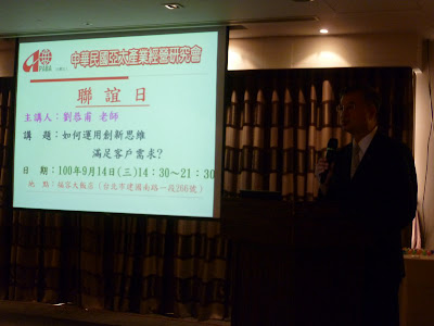 1. 很感謝亞太產業經營研究會(http://www.apaba.org.tw/) 邀請我對於「如何運用創新思維滿足客戶需求」這個主題發表演說,亞太產業經營研究會成立於1995年,是個關心台灣產業前途,超越政治的公益性社團,同時也是兼具高格調知性與感性的異業交流與產業研究的聯誼會。其成員以中小企業經營者及專業經理人為主,擁有常年會員250名,每月固定邀請各界學者、菁英前來演講。「如何運用創新思維滿足客戶需求」這個主題的選定代表亞太產業經營研究會是個走在產業前端的組織。